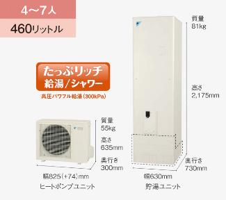 [各型番] 貯湯ユニット:TUN46MFV ヒートポンプユニット:RQWN60MV リモコン:コミュニケーションリモコン(BRC981D1)[各寸法]貯湯ユニット寸法:高さ2,175×幅630×奥行き730mm ヒートポンプユニット寸法:高さ635×幅825(+74)×奥行き300mm[機能一覧] 便利機能 エコ停止 ○ 運転停止日数設定 ○ 沸き増し/満タン運転 ○ 多め・深夜のみ - おまかせ/省エネ・たっぷり - おまかせ/たっぷり/少なめ ○ キッチンタイマー ○ ふろタイマー ○ 伝言メモ ○ 快適・安心機能 ツイン給湯 ○ 高圧給湯(170kPa) ○ 低運転音 ○ チャイルドロック ○ 非常用水取出し ○ お風呂機能 ふろ自動 ○ 自動保温 ○ 自動たし湯 ○ 自動たし湯入切 ○ 追いだき ○ たし湯 ○ さし水 ○ 高温たし湯 ○ 配管洗浄運転 ○ リモコン機能 コミュニケーション(通話) ○ おしらせ ○ 文字表示機能 ○ サブリモコン対応(別売) ○ 試運転ナビ(サービス・施工) ○ ※こちらの商品は、メーカー直送品のために代金引換で発送することができません。